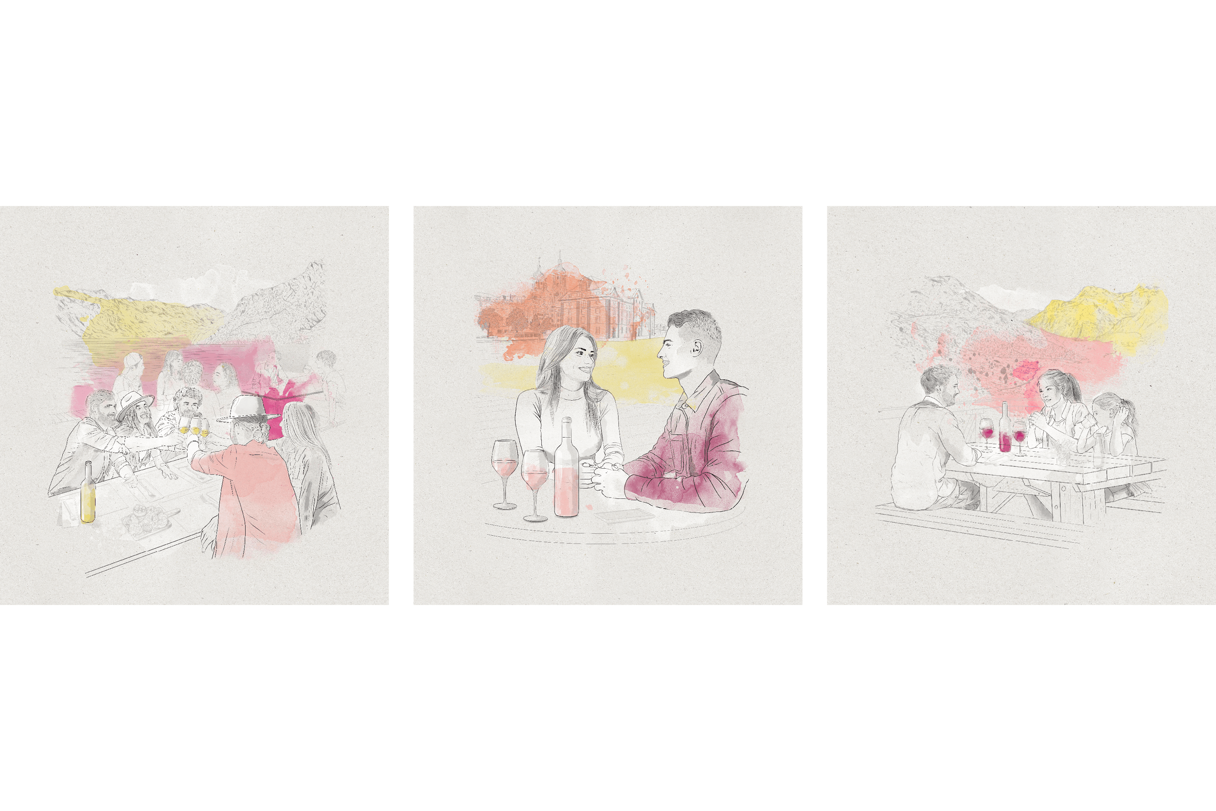 J’ai créé une série d’illustrations pour la campagne nationale Swiss Wine Summer, destinée à promouvoir les vins suisses dans le secteur de l’hôtellerie-restauration durant l’été. Les illustrations mettent en scène l’univers estival du vin suisse à travers des visuels frais, conviviaux et rappelant les couleurs des vins.